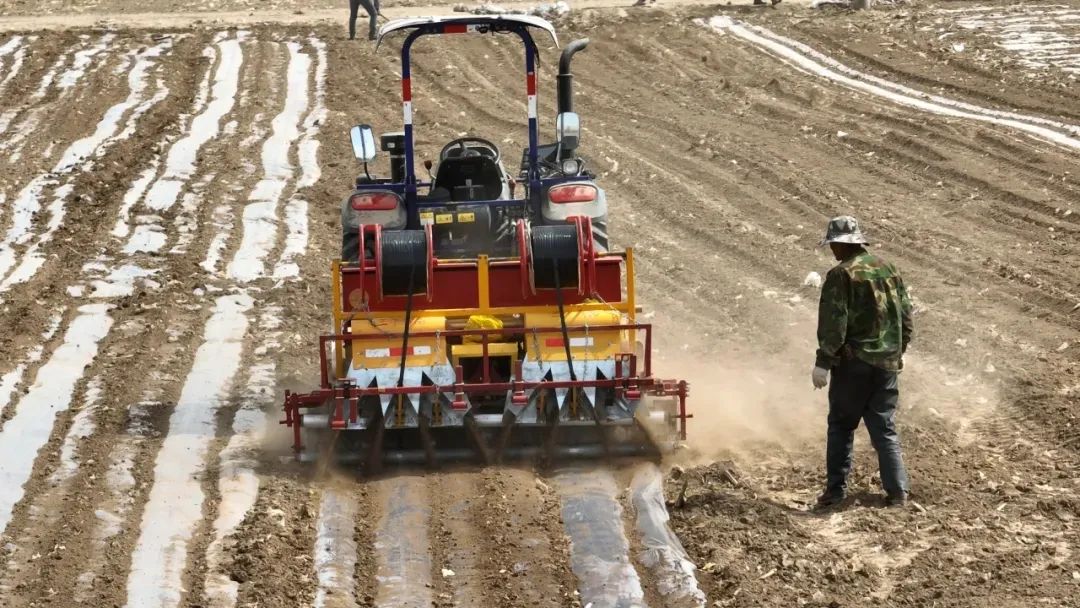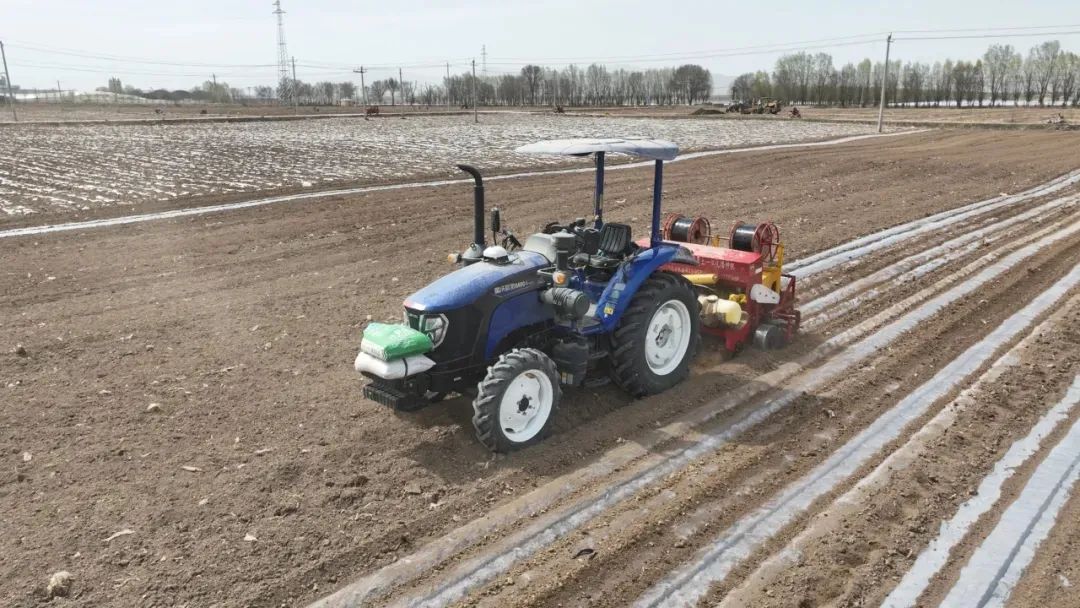 在技术人员设定参数后,搭载北斗导航系统的播种机自动规划路线,灵活地转弯、掉头,所到之处,土地被整齐地翻耕,地膜被平整铺展。机身配备的智能传感器实时监测土壤湿度、种子间距等关键数据。