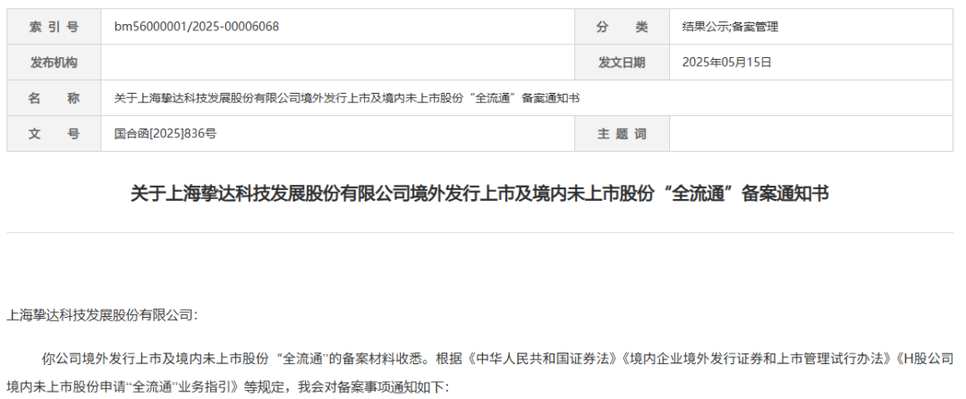 近日,中国证监会国际合作司发布关于上海挚达科技发展股份有限公司境外发行上市及境内未上市股份“全流通”备案通知书。