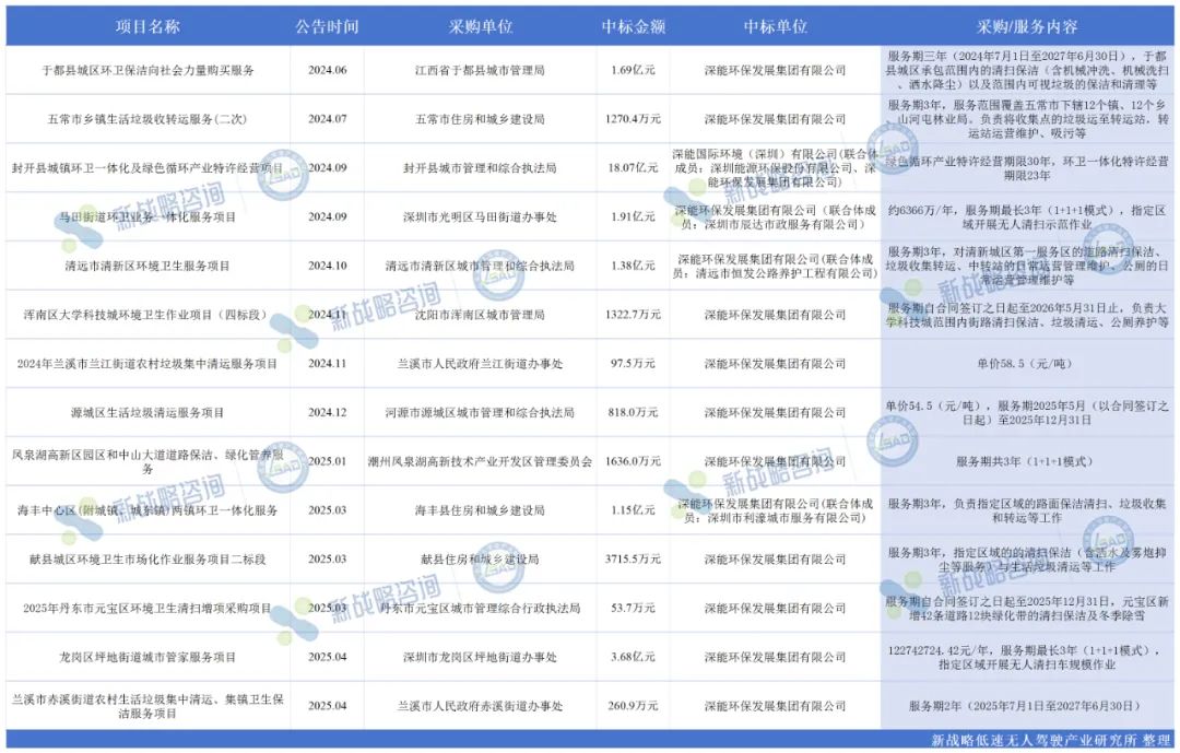 新战略低速无人驾驶产业研究所统计信息显示,深能环保过去一年(2024年6月至2025年5月)已获得深圳、兰溪、清远、河源、丹东等多个城市的10余个环卫服务项目(不含续签合同及纯设备采购租赁项目)。