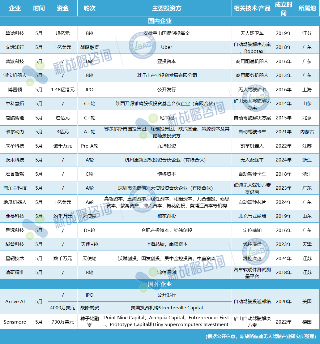 2025年5月自动驾驶领域融资情况(根据公开信息整理,未完善之处请指正!)