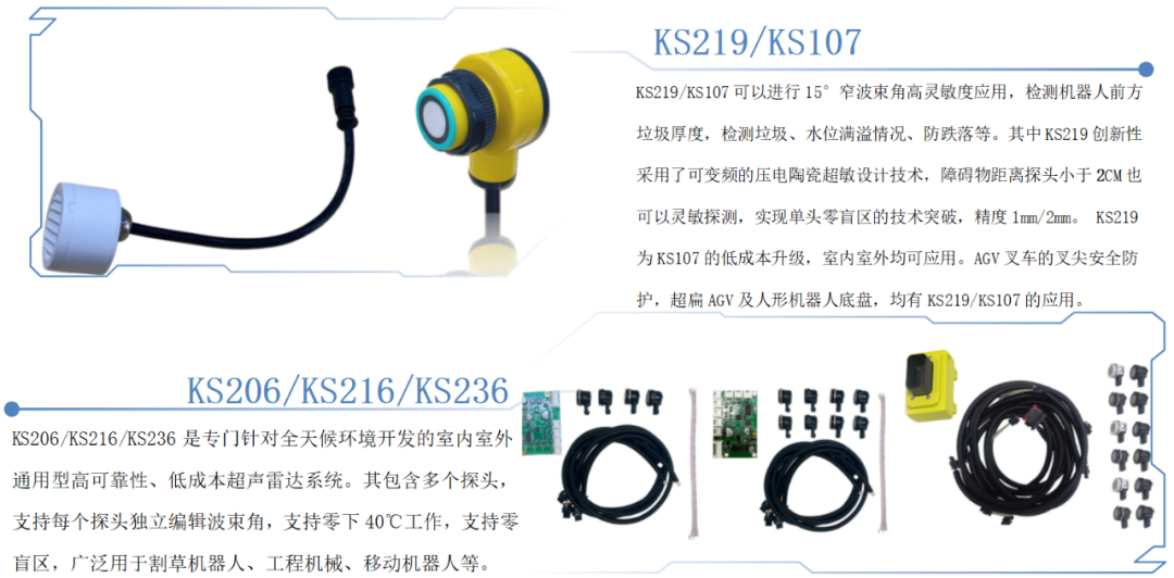 对于矿山车、物流车、港口车辆,可以采用KS236的10~12探头,波束角编辑为水平100°竖直50°或更大。由于每个探头均可独立编辑波束角,对于机器人的不同部位的探测FOV要求适应性好。KS236整机防水,对于一些越野、建筑、牧场、矿山、暴雨等泥泞扬尘场合均可可靠工作。