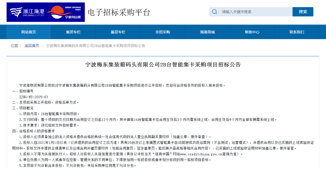 据了解,整个项目的交付日期为合同签订之日起12个月内,其中首批14台智能集卡在合同生效后3个月内需系统上线,合同生效后4个月内全部车辆需系统上线。