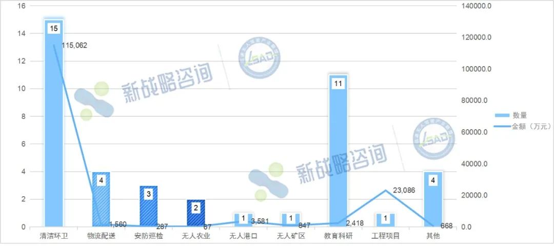 其次是河南省,清洁环卫、无人矿区、安防巡检、教育科研多个领域都有项目。