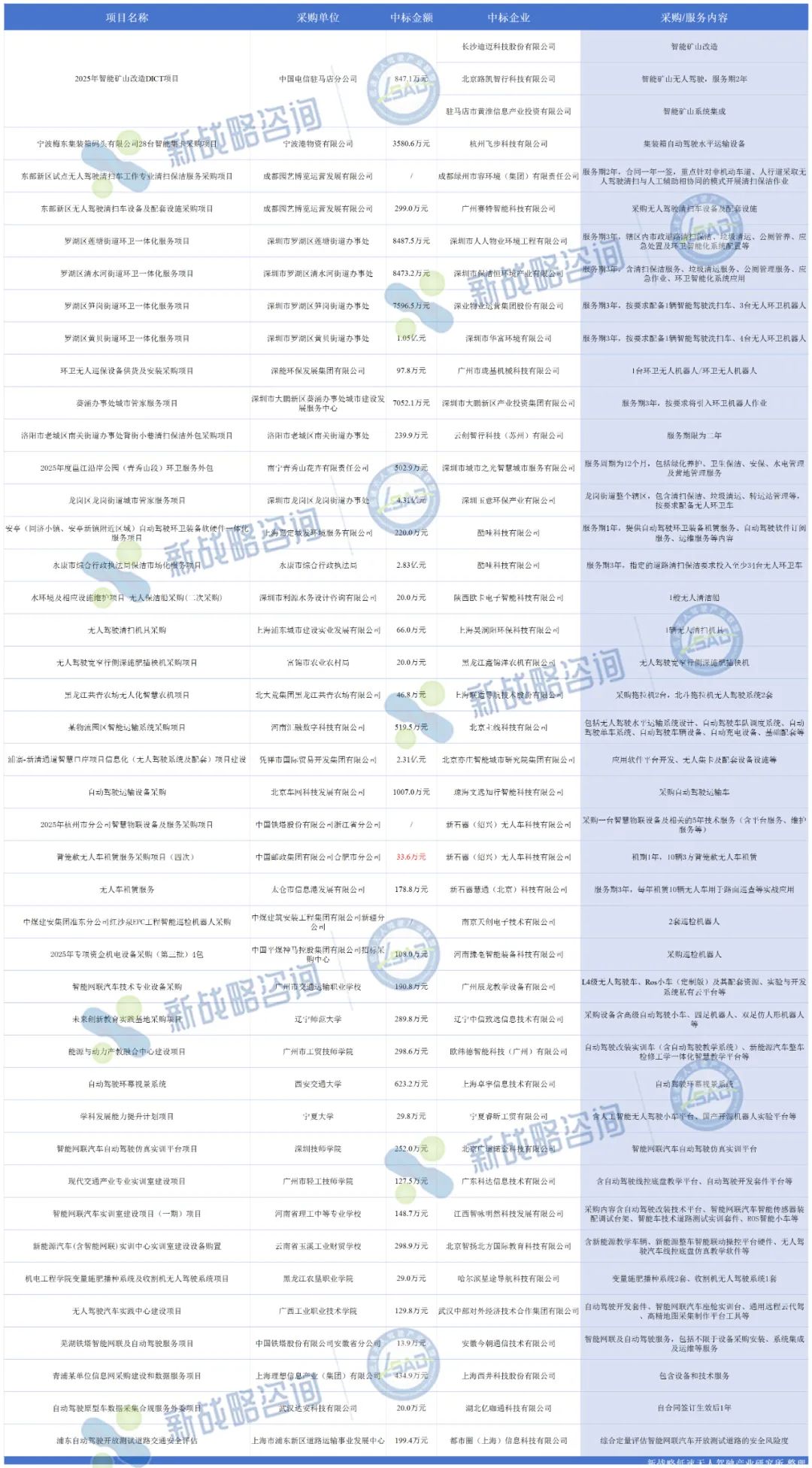 根据公开信息,新战略低速无人驾驶产业研究所不完全统计,2025年5月,国内自动驾驶领域公开超40项中标结果公告(不含延续合同,重点统计低速无人驾驶领域项目),披露的服务期总金额近15亿元,为本年度统计月度最高。