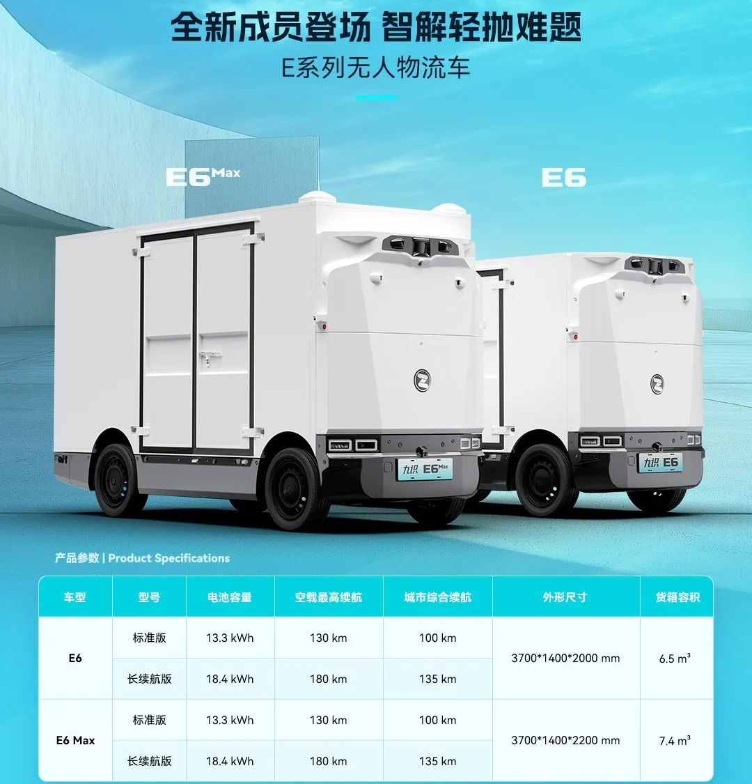 6月19日,九识智能官宣推出E6长续航版、E6MAX、E6MAX长续航版,这三款E系列升级车型,针对续航能力和货舱空间进行了提升。