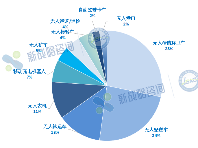 从产品类型来看,用于清洁环卫场景的无人车新品数量最多,共有13款,占比28%,包括9款无人清扫环卫车和3款清洁机器人以及1款水面无人驾驶清洁船;其次是无人配送领域新品11款,占比24%;园区物流转运车和无人农机产品分别有6款和5款。