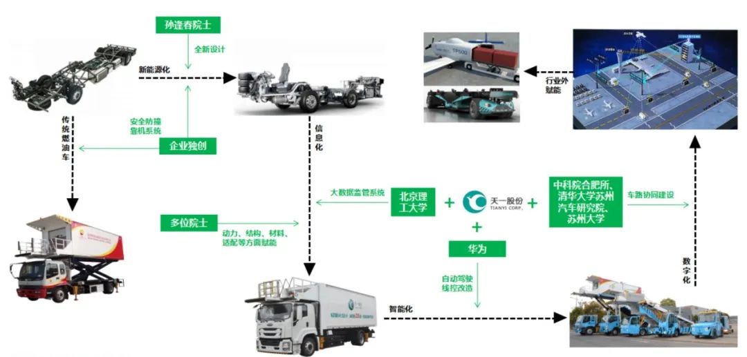 目前,天一航空的机场无人驾驶产品矩阵已涵盖旅客登机梯、垃圾车、行李传送车、行李牵引车、航空食品车、摆渡车等众多车型。