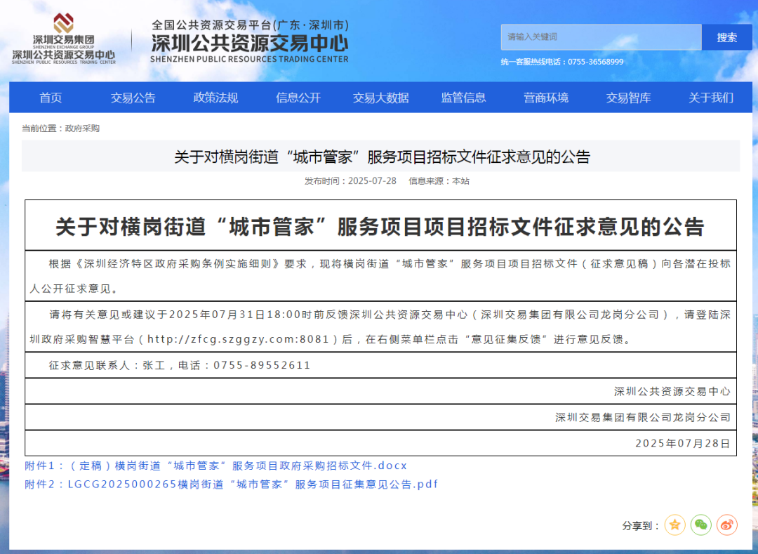 7月28日,深圳市龙岗区横岗街道“城市管家”服务项目招标文件公开征求意见。(PC端点击“阅读原文”,可查看招标文件详情)