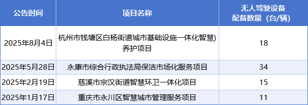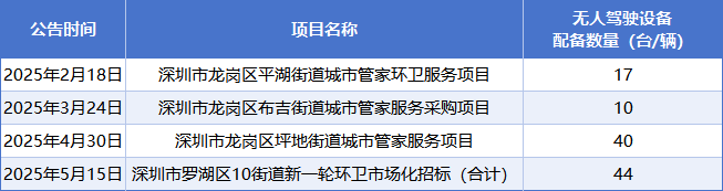 2月份开标的深圳市龙岗区平湖街道城市管家环卫服务项目,要求配备智能环卫设备17台(辆);3月份开标的深圳市龙岗区布吉街道城市管家项目,要求配备智能环卫设备10台(辆);4月份开标的深圳市龙岗区坪地街道城市管家项目,要求配备智能环卫小型机扫车40台(辆)。5月份,随着清水河街道环卫一体化项目结果公布,深圳市罗湖区10街道新一轮环卫市场化招标结果全部出炉,本轮次显示罗湖区10个街道一体化项目共需配置无人智能环卫设备44台(辆)。