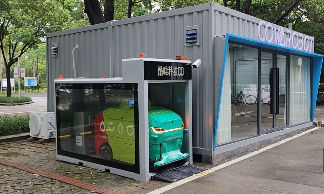 同时,为了保障机器人在续航方面的需求以及特殊场景的应对能力,酷哇科技的环卫机器人采用“充电+换电”双模式:在电量不足时,机器人可自主前往就近的“机器人之家”进行快速充电与补水,最快约30分钟即可充满,像这样用于支持自动充电和补水的设施,在石井街道已建成6个;此外,还配备了专门的“保姆车”,在日常巡检中为低电量车辆迅速更换电池,通常几分钟即可完成。在满电状态下,根据不同作业工况,机器人能够连续工作6至8小时。