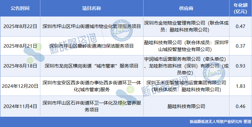 也正因为具备这样的技术积累与产业化能力,酷哇科技才能在不到一年时间内拿下深圳五个城市服务项目,横跨深圳宝安区、龙岗区和坪山区,年化总额超4亿、合同总额近12.2亿。