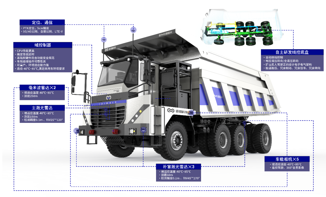 整车部分,铱钼无人驾驶宽体矿卡使用全自研线控底盘,专为各类露天矿区环境设计,深度融合无人驾驶技术、先进传感器技术与可靠通信技术,应用于216~300吨位车型上,其中EM216H额定载重150吨,为国内同类车型载重最大车型,后续的260吨的无人驾驶车型正在研发中。