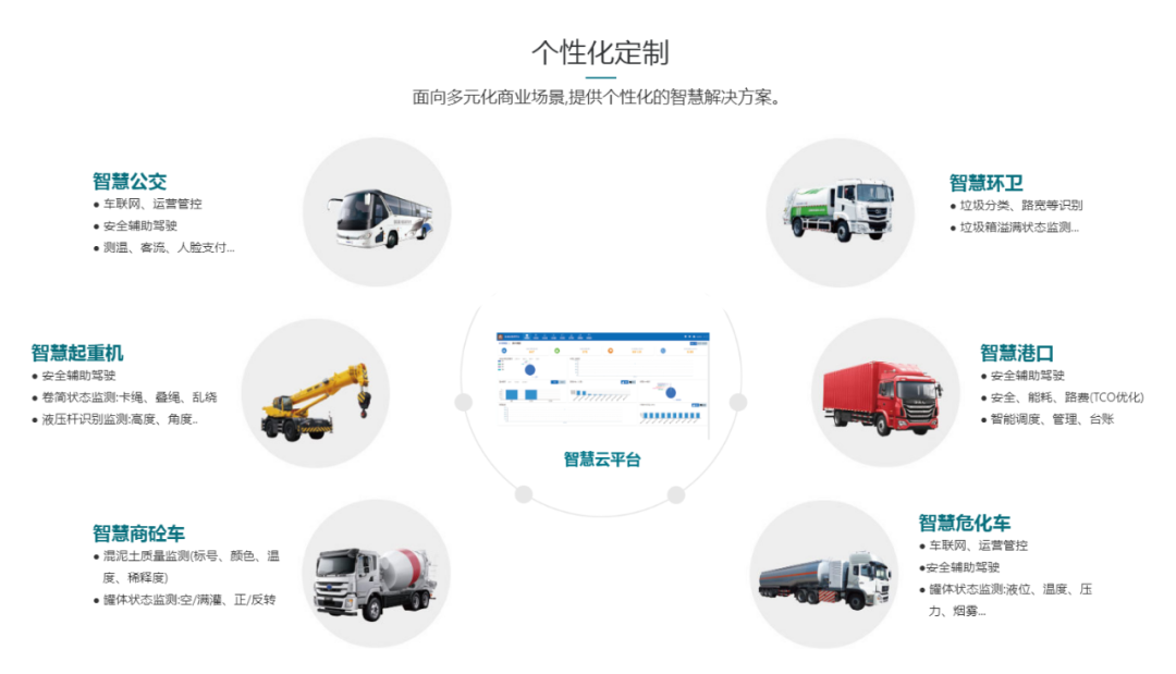 智能驾驶:立足于Al智能化技术的本质,以智能车载设备为抓手,以商用车联网为主体躯干,构建针对商用车业务场景的数据引擎+多任务Al模型引擎的“双驱动”智能化解决方案。