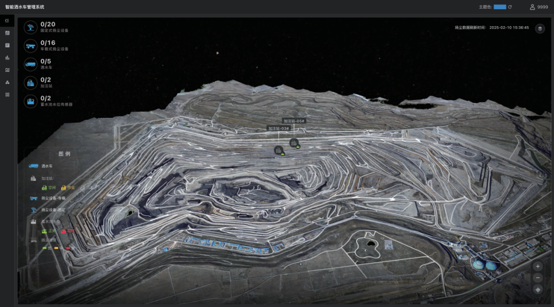 大屏监控:实时展示矿区所有洒水车、加注站及扬尘设备状态,细分至每条道路扬尘指数;