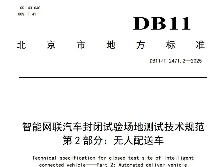 近日,北京市市场监督管理局发布了4项自动驾驶领域地方标准,涉及智能网联汽车封闭试验场地测试、车路云一体化路侧基础设施两大核心领域,包括《智能网联汽车封闭试验场地测试技术规范 第1部分:乘用车》《智能网联汽车封闭试验场地测试技术规范 第2部分:无人配送车》《车路云一体化路侧基础设施 第6部分:信息安全技术要求》《车路云一体化路侧基础设施 第7部分:运维管理系统应用技术要求》。