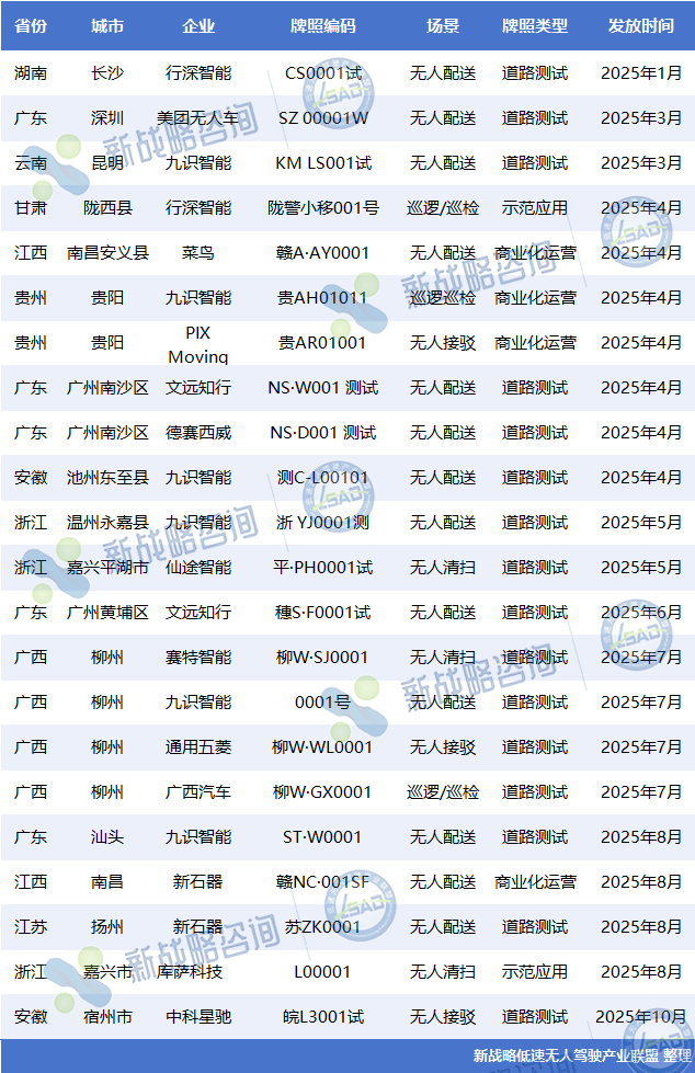 2025年以来低速无人车牌照发放情况(根据公开信息整理,未完善之处请指正!)