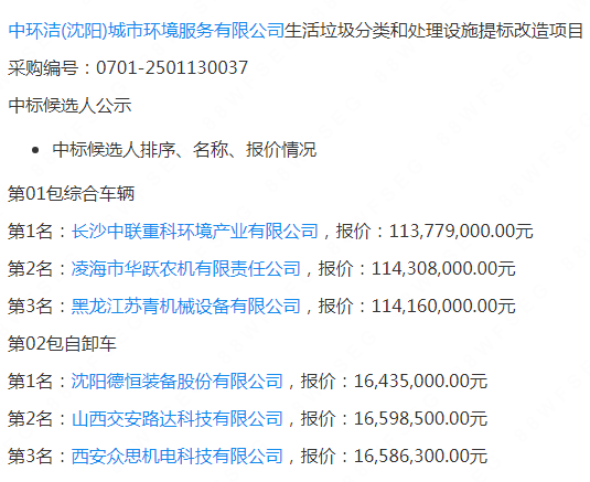 新战略低速无人驾驶全媒体获悉,10月26日,中环洁(沈阳)城市环境服务有限公司生活垃圾分类和处理设施提标改造项目中标候选人公示,长沙中联重科环境产业有限公司为第01包综合车辆第一候选人,沈阳德恒装备股份有限公司为第02包自卸车第一候选人。