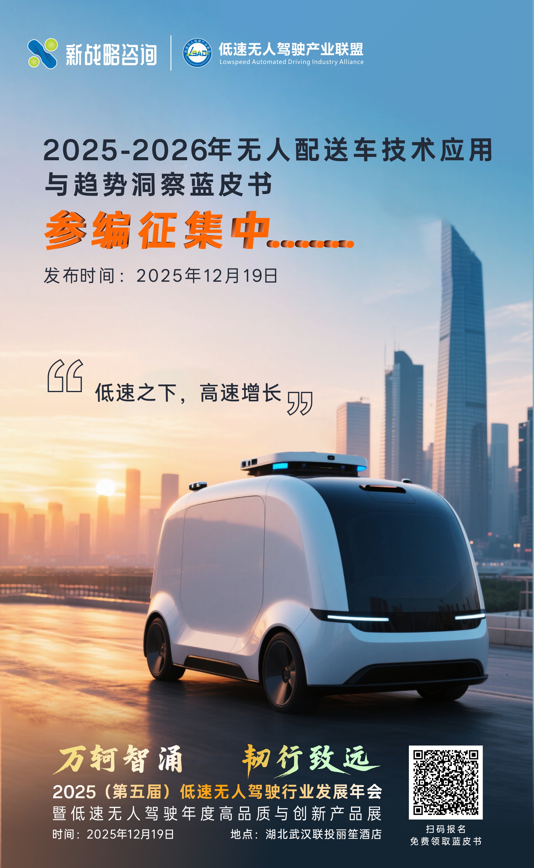 2025年12月19日,低速无人驾驶产业联盟、武汉军山新城将在国家智能网联汽车(武汉)测试示范区联合主办“2025(第五届)低速无人驾驶行业发展年会”,会上还将重磅发布《2025-2026年无人配送车技术应用与趋势洞察蓝皮书》,参会免费领取,敬请期待!