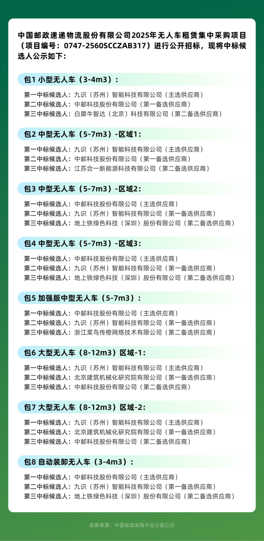 不止如此,在中国邮政近期公布的全球最大规模无人车租赁集采项目结果中,九识智能(Zelos)包揽该项目全部标段,并在第1、2、6、7四个标段中以绝对优势确定为主供应商,成为中国邮政无人运力核心合作伙伴,实现全球顶尖科技力量与中国“国家队”物流体系中的深入嵌入。