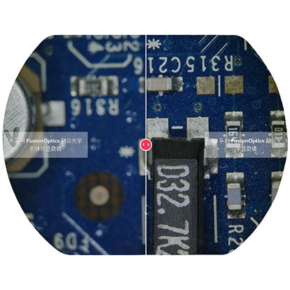 (注:图像模拟,所示为通过目镜观察到的具有和不具有 FusionOptics 融合光学效果的印刷电路板样品。)