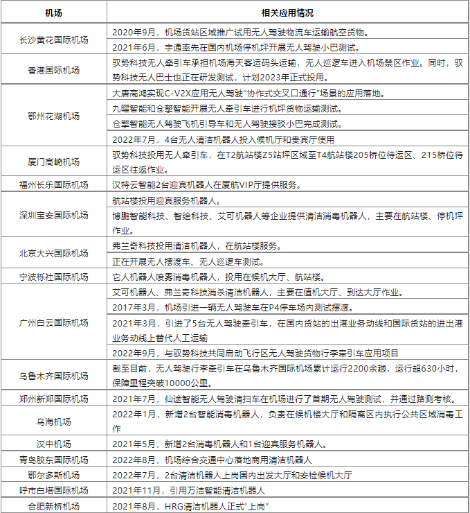 从国内部分机场无人驾驶应用情况来看,目前机场测试应用最多的无人驾驶车辆和设备主要为无人清扫车、迎宾机器人、消杀机器人、无人牵引车,无人巡逻车、无人接驳车、无人驾驶飞机引导车也在近年取得新的技术和应用突破。